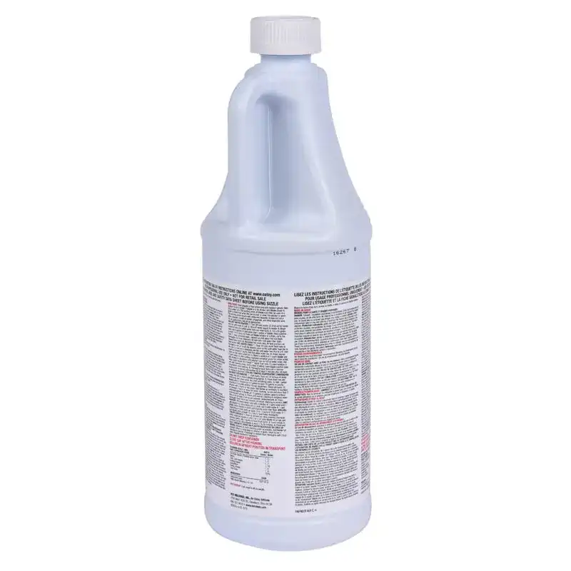 A chemically-reactive product which effectively removes deposits of carbonates, sulfates, phosphates, oxides, urinary salts and other mineral deposits. Triple action formula of virgin hydrochloric acid blended with selected corrosion inhibitors and a strong foam suppressant, Sizzle dissolves inorganic deposits that restrict flow of water and waste. Removal of these deposits restores heat transfer efficiency to boilers, radiametertors, and water heaters. Sizzle can be safely used with iron, steel, copper, brass, bronze and lead fixtures to quickly dissolve scale and mineral build-up from water, waste, heating, processing and air conditioning systems. Clears plaster, grout and concrete obstructions from new and old construction. Sizzles SAF-T-POR Spout is provided free with each 1 gallon jug, permitting safe, easy, pinpoint application of Sizzle without hazardous splashing.